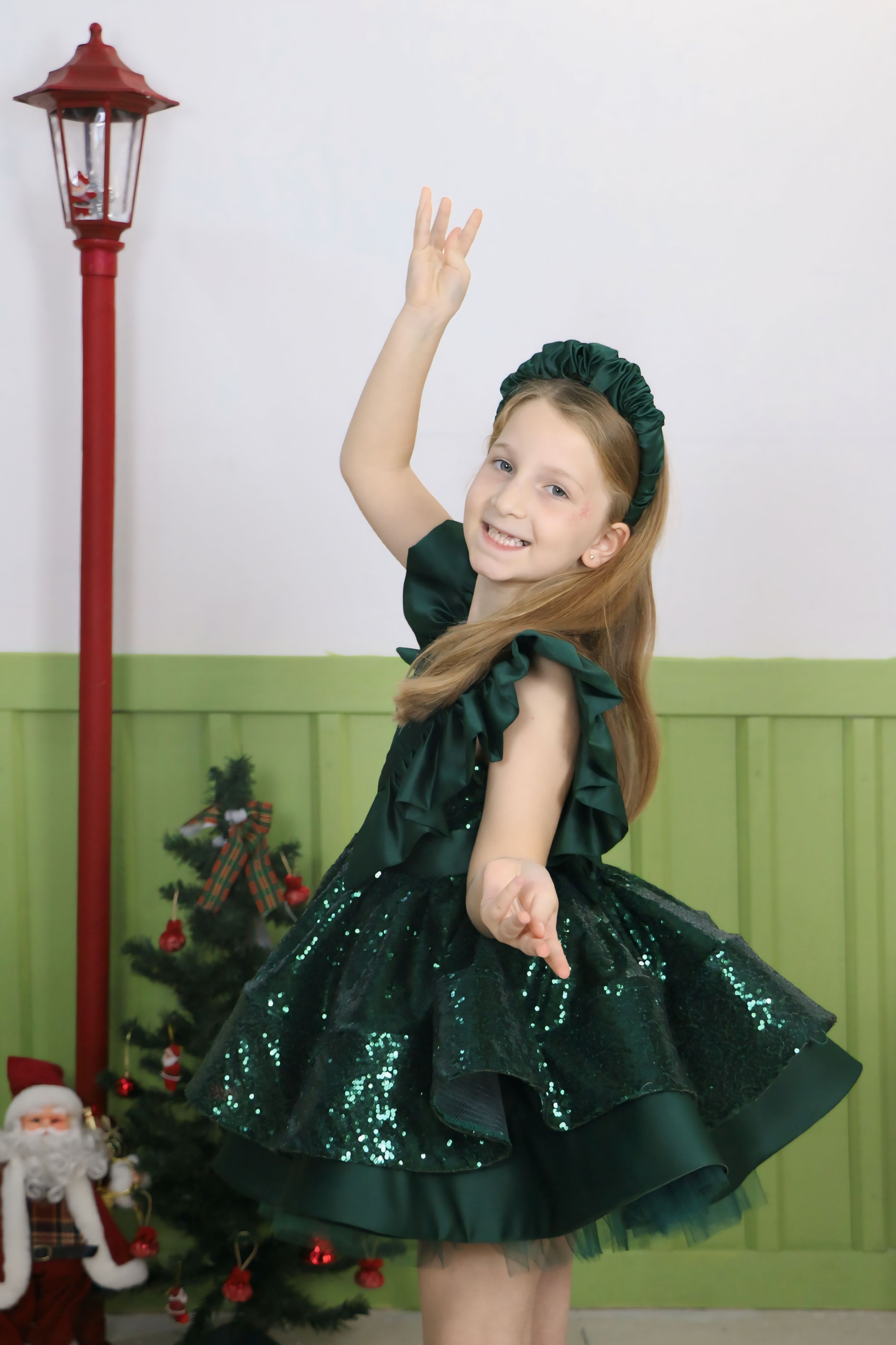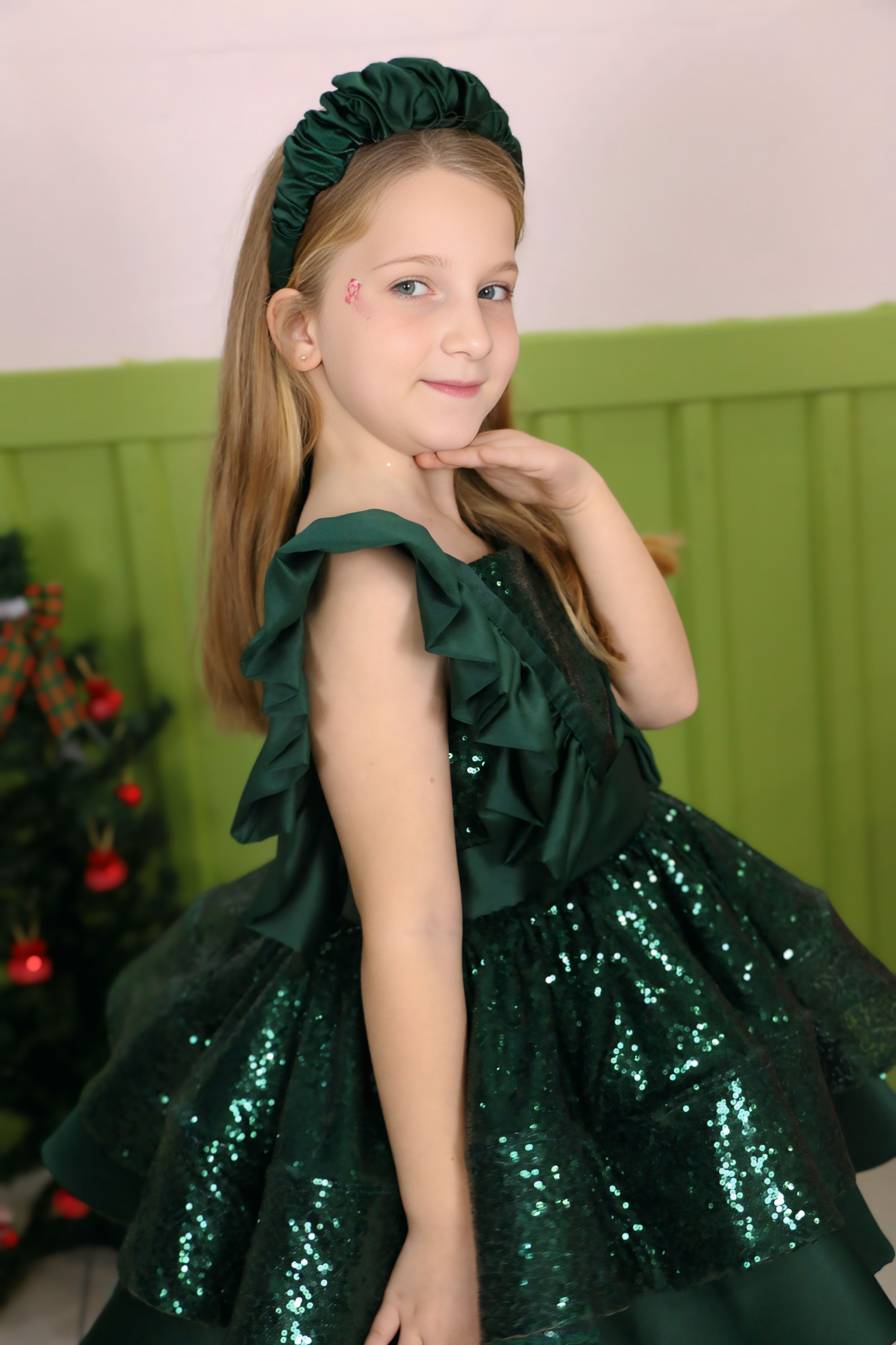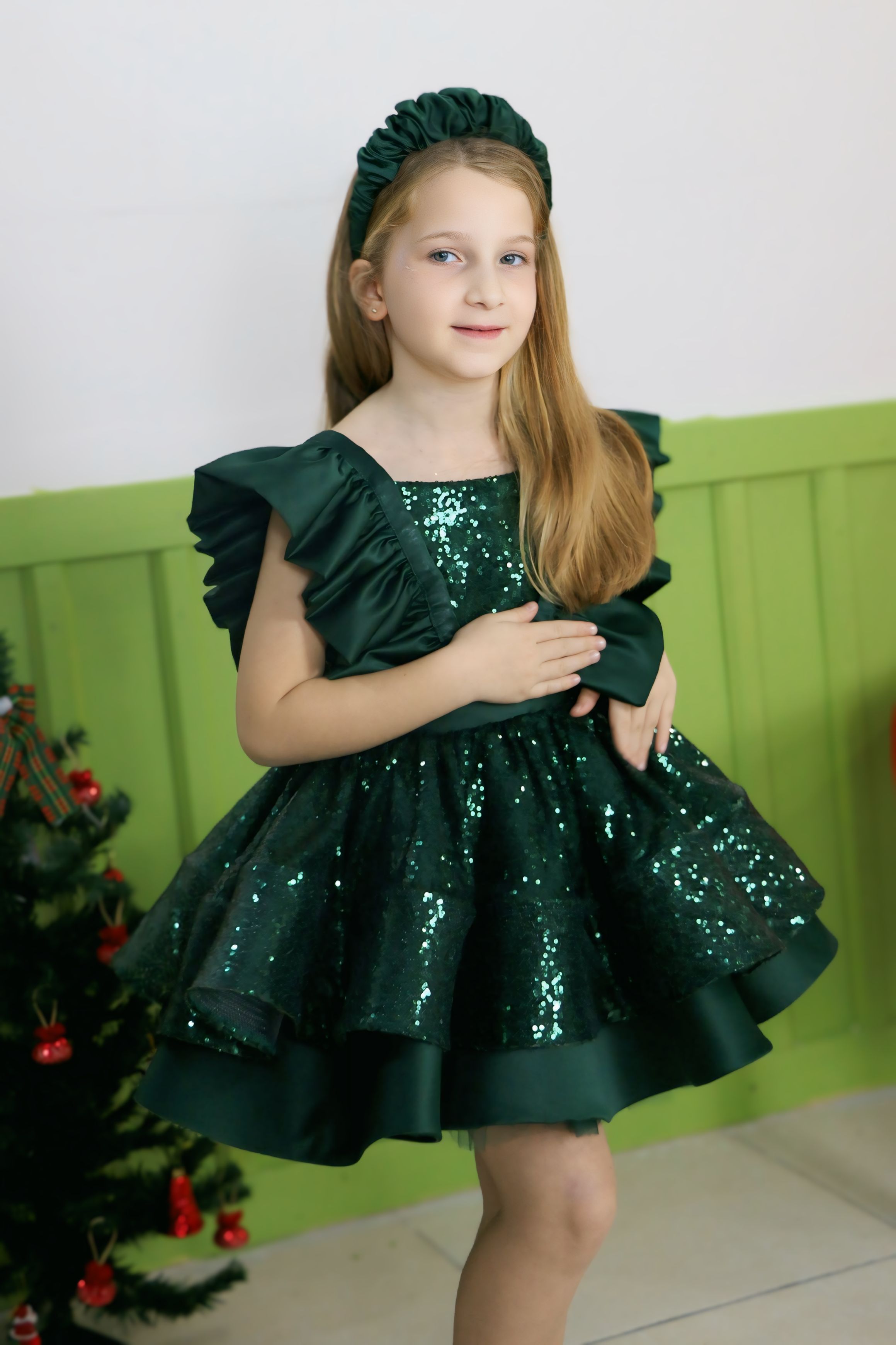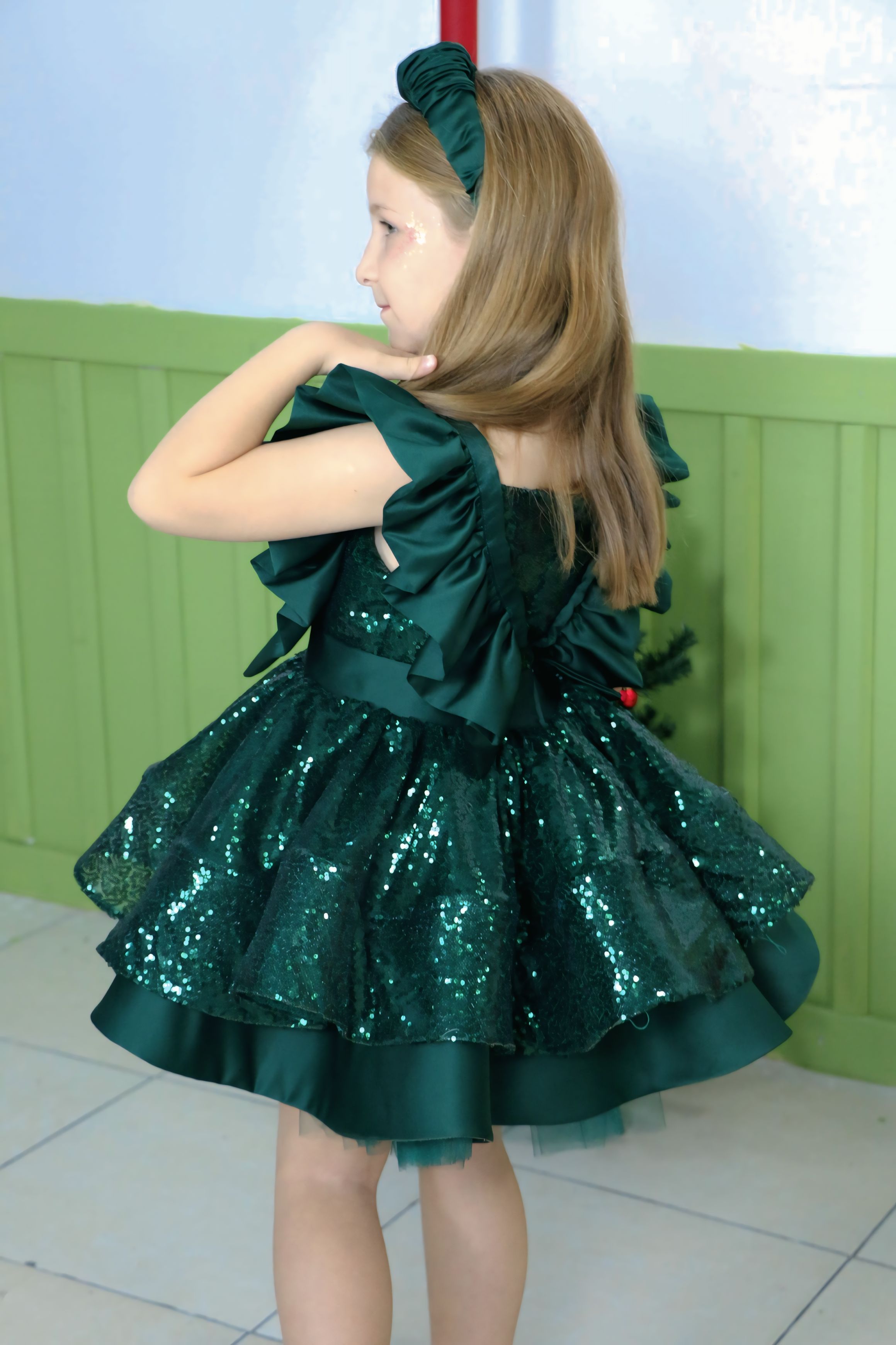ELBİSE SATEN VE PULLU KUMAŞTAN YAPILMIŞTIR.
